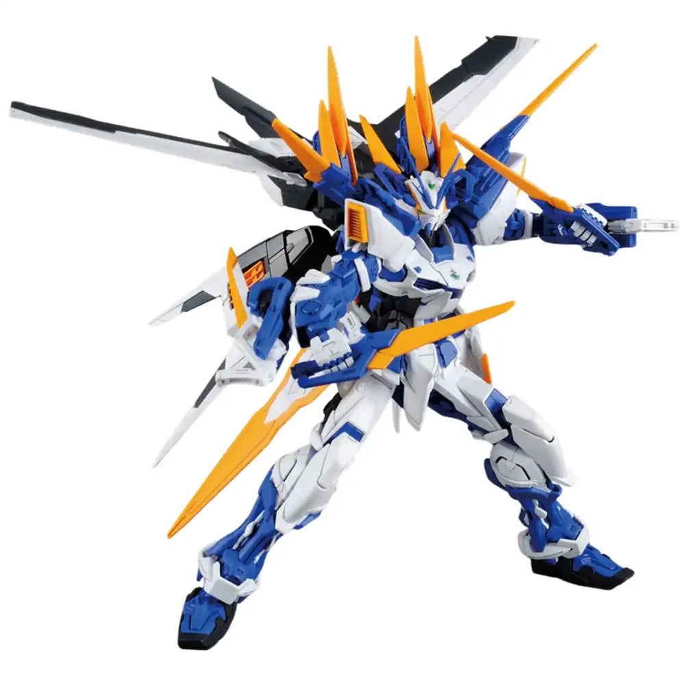 MG 1/100 Gundam Astray Blue Frame D is a plastic model kit produced by BANDAI SPIRITS as part of the Master Grade (MG) lineup. It is based on the MBF-P03D Gundam Astray Blue Frame D from the Mobile Suit Gundam SEED side story series. The kit is molded in color and requires assembly, featuring articulated inner frame parts, exterior armor, and included weapon accessories and marking decals as part of the set contents.