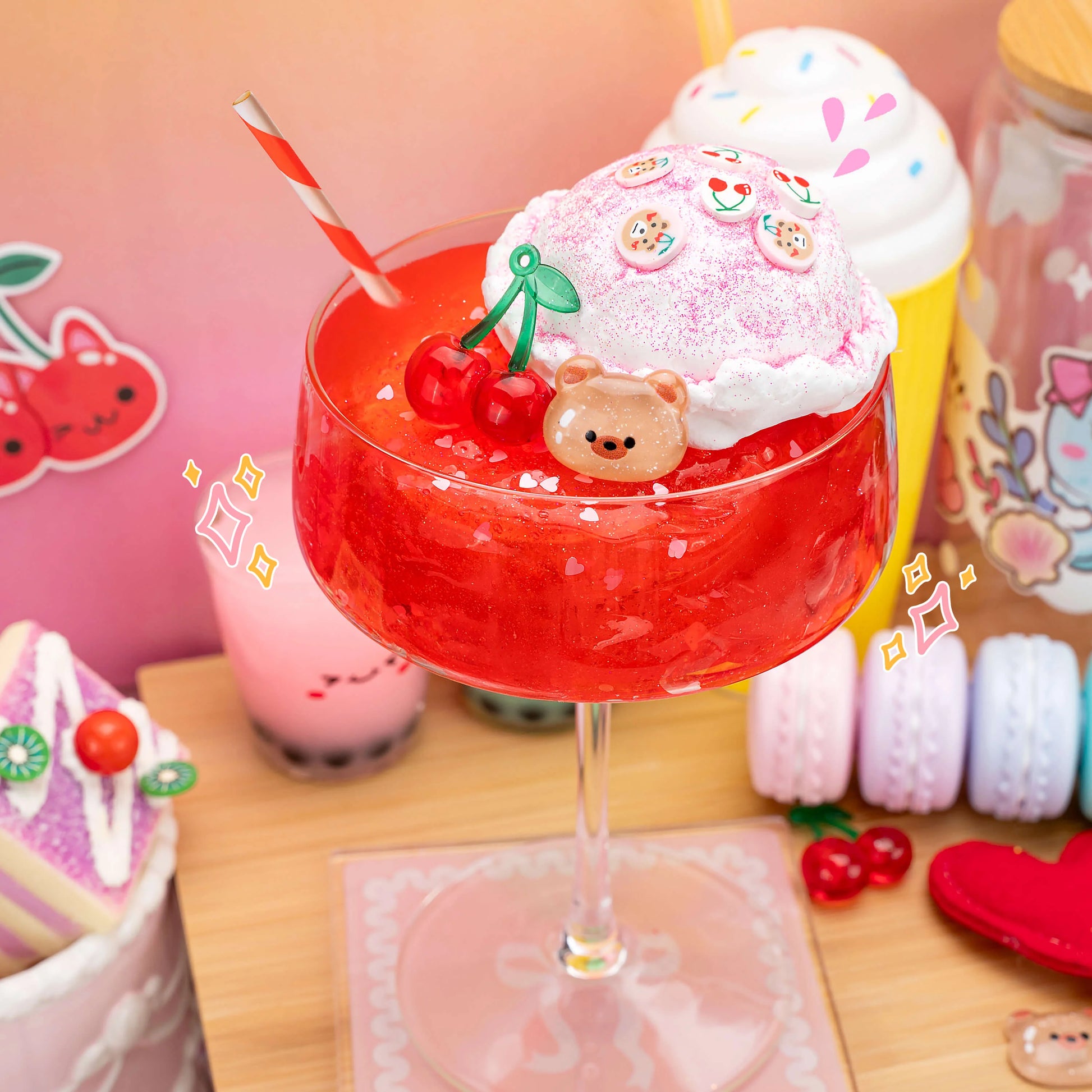 This product is a sensory toy designed as Bear’s Best Shirley Temple Float Slime. It features a glossy slime base with a mirror-like finish combined with an additional clay component that can be mixed to create a layered texture experience. The scent profile is inspired by a cherry lemon-lime soda beverage, providing a sweet and citrus-based aroma. Decorative elements such as a bear charm, cherry-themed pieces, and sprinkle toppings are included to enhance visual interaction. It is intended for tactile play and sensory interaction rather than consumption. Usage involves stretching, mixing the components, and pressing the slime to experience changes in texture and appearance.