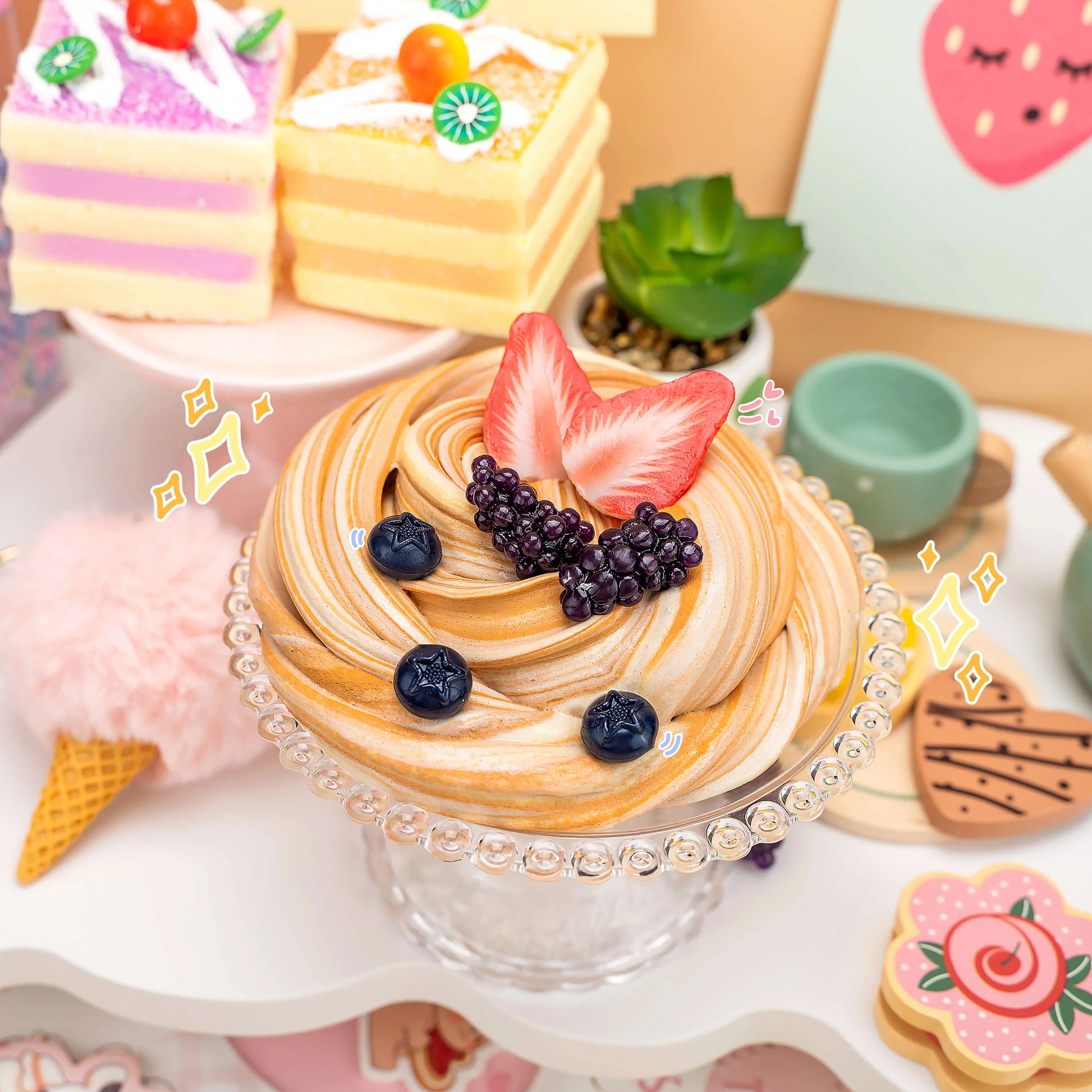This product is a sensory toy designed as Japanese Cheesecake Scented Slime. It is formulated to mimic the texture of Japanese-style cheesecake, which is known for its light, airy, and sponge-like consistency. The slime uses a soft, creamy base that allows stretching, poking, and molding while maintaining a fluffy and slightly dense texture. The scent profile is inspired by cheesecake desserts, featuring sweet sponge cake notes combined with cream cheese and berry-like fragrance elements. It is intended for tactile play and sensory interaction rather than consumption. Usage involves stretching, pressing, and folding the slime to experience its soft texture and dessert-inspired scent.