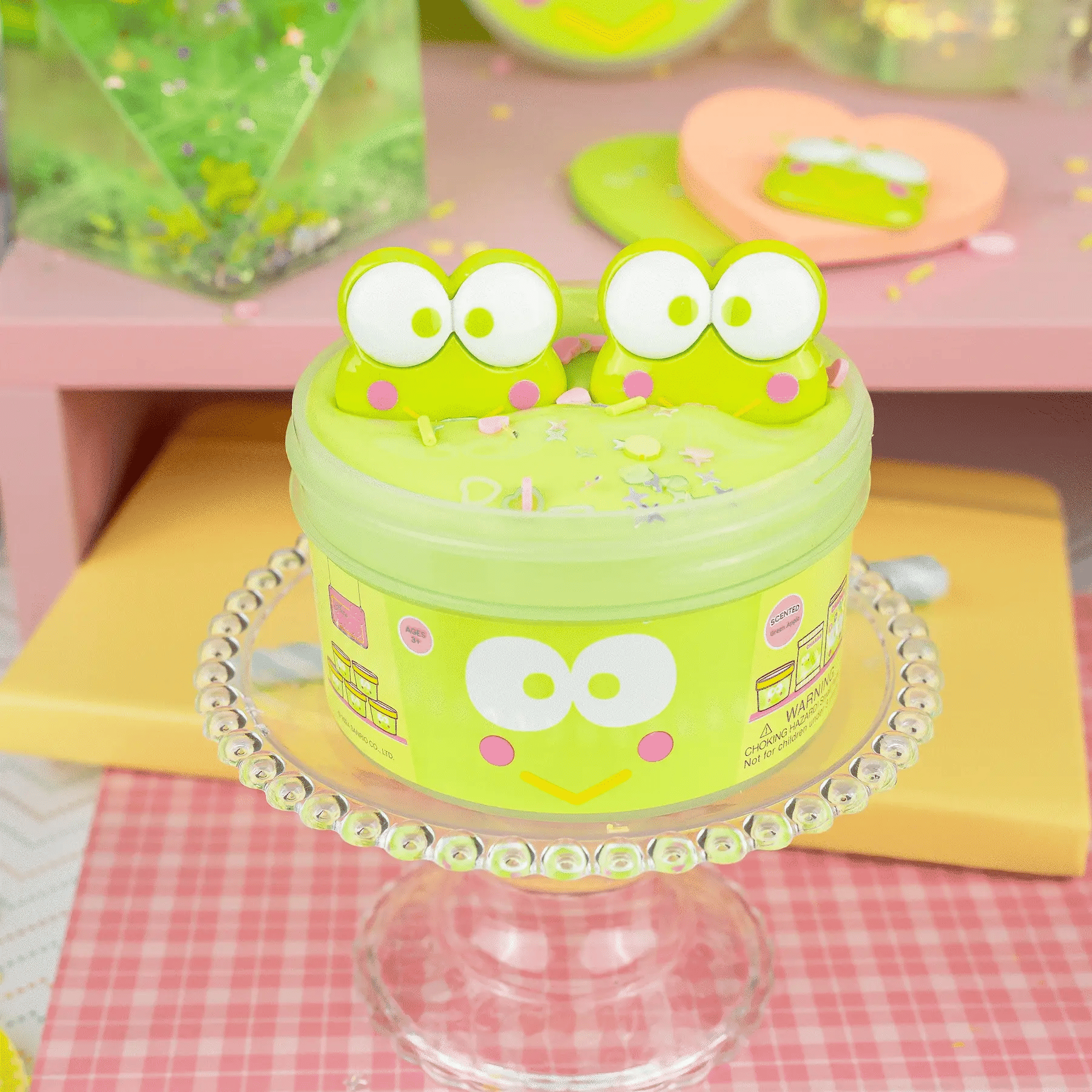 This product is a sensory toy created in collaboration with Sanrio, featuring the Keroppi character. It is designed as a glossy slime with a thick, smooth, and stretchy texture that produces a shiny surface during handling. The slime is characterized by a bright green color and includes decorative elements such as Keroppi-themed charms and sprinkle add-ins for visual detail. The scent profile is inspired by green apple fragrance, providing a sweet and slightly tart aroma. It is intended for tactile play and sensory interaction rather than consumption. Usage involves stretching, pressing, and folding the slime to experience its glossy elasticity and embedded decorative components.