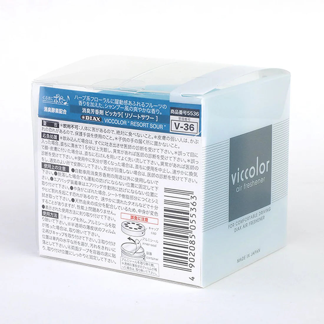 This product is a gel-type car air freshener manufactured in Japan by Dia Chemical under the DIAX VICCOLOR series. The fragrance variant is listed as Resort Sour. The container holds deodorizing fragrance gel designed to be placed inside a vehicle interior such as a dashboard or cup holder, allowing scent to diffuse gradually into the surrounding space. The listed net content is approximately 85 g and the product is distributed as a single unit depending on the retailer.